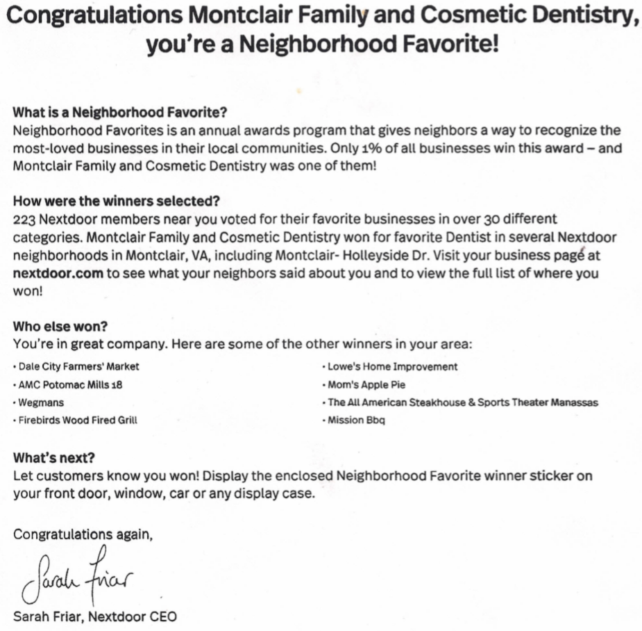 Montclair Family and Cosmetic Dentistry recently won the Next Door online voting contest for best dental office in Montclair, VA and surrounding regions. Congratulations to Dr. Anh N. Zirnstein, DDS, owner of this dental business and Dr. Paul W. Conrad, the previous owner of this business, who still works here to take care of his long time patients. Only the top 1% of businesses in this region received this distinguished award presented by the people that actually live in the area and love and support these businesses.